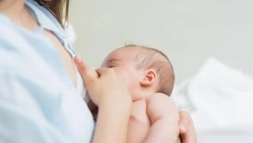 感觉宝宝已经吃差不多了,宝妈可以先将宝宝松开,然后用手指轻点宝宝的小下巴。